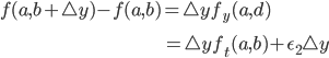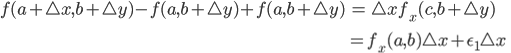 자, 이제 $\triangle z=f(a+\triangle x, b+\triangle y)-f(a,b)\\ \quad\; = f(a+\triangle x, b+\triangle y)-f(a,b+\triangle y)+f(a,b+\triangle y)-f(a,b)$ 라고 해봅시다.