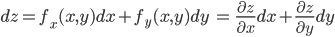 즉, $dx$와 $dy$는 임의값으로 주어질 수 있다. 이 때, 미분 $dz$는 다음과 같이 정의된다.
